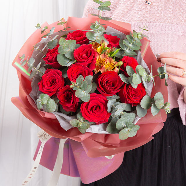花材:11枝红玫瑰,搭配尤加利叶、橙色水仙百合