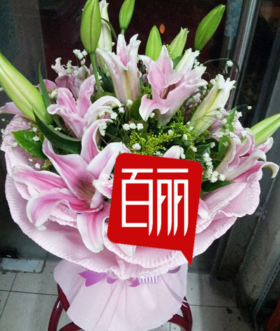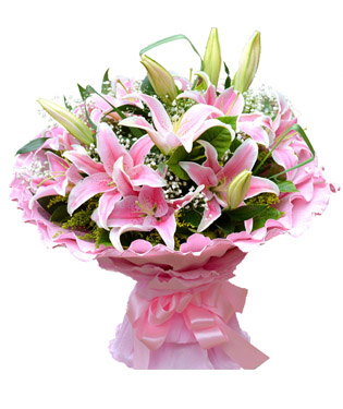【花材】:6枝多头粉色百合,搭配黄莺 满天星 绿叶