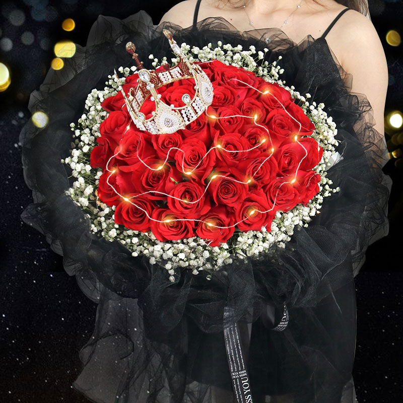 花材:33朵红玫瑰+彩灯+皇冠(款式随机),满天星搭配