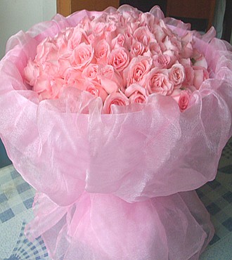百丽鲜花网上这款“爱你久久”,99枝粉玫瑰,粉色纱网包装