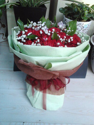 花 材: 36枝红色康乃馨,竹蕉间插,满天星丰满,栀子叶间插。