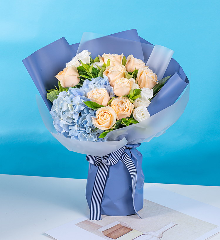 花材:香槟玫瑰11枝,蓝绣球1枝,白色洋桔梗2枝,栀子叶10枝,白色洋桔梗2枝,栀子叶10枝
