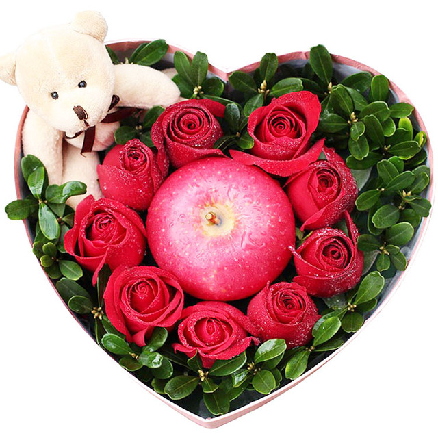 花材:11朵红玫瑰,满天星搭配,一个平安果