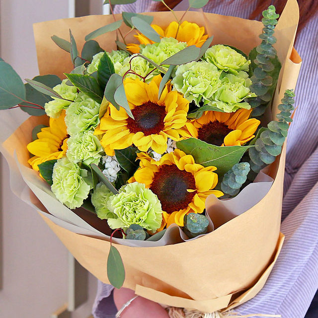 花材:6朵向日葵,尤加利叶、绿色康乃馨、相思梅