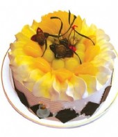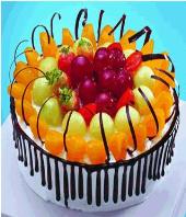- 8寸鲜奶水果蛋糕,中心放各色时令水果,扇形巧克力插片