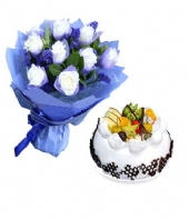 - 白玫瑰9枝单枝包装,(勿忘我点缀),8寸水果鲜奶蛋糕