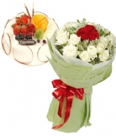 【中间红玫瑰3枝,白玫瑰16枝外围,高山积雪丰满】+【8寸圆形鲜奶水果蛋糕】