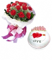 - 红玫瑰11枝,满天星、绿叶丰满+8寸奶油蛋糕