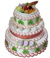 三层圆形蛋糕,由奶油,水果,鲜各色玫瑰等材料组成,绝对新鲜.美味可口.