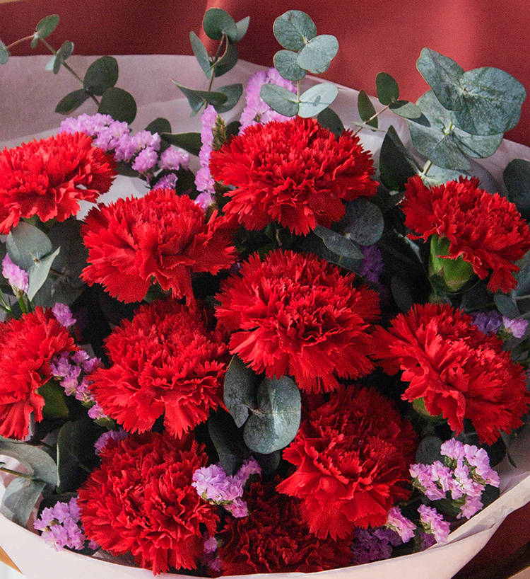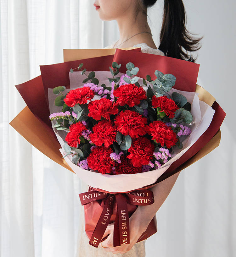 红色康乃馨11枝,粉色勿忘我或满天星、尤加利搭配