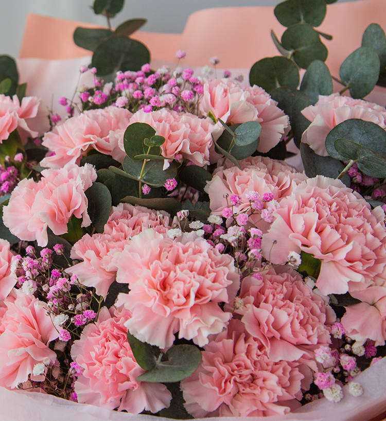 11枝粉色康乃馨、浅粉满天星、尤加利搭配