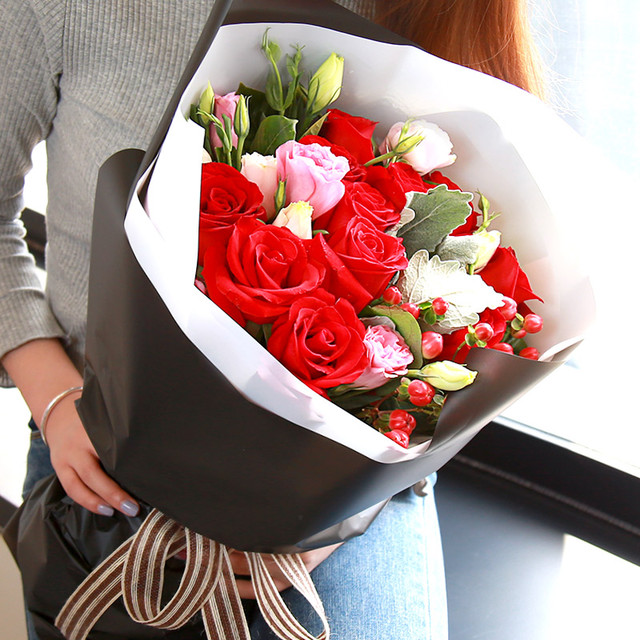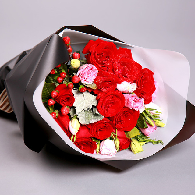 11朵红玫瑰,搭配粉色桔梗、银叶菊、相思豆