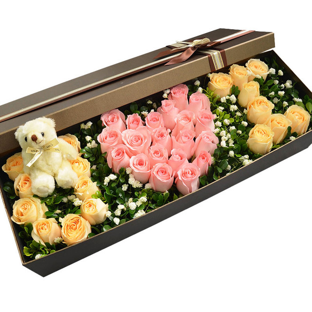 36朵玫瑰(香槟+粉),绿叶、满天星,小熊