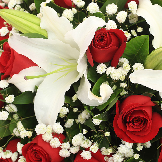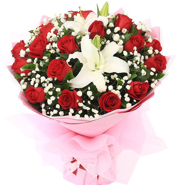 19枝红玫瑰,香水百合、栀子叶、满天星
