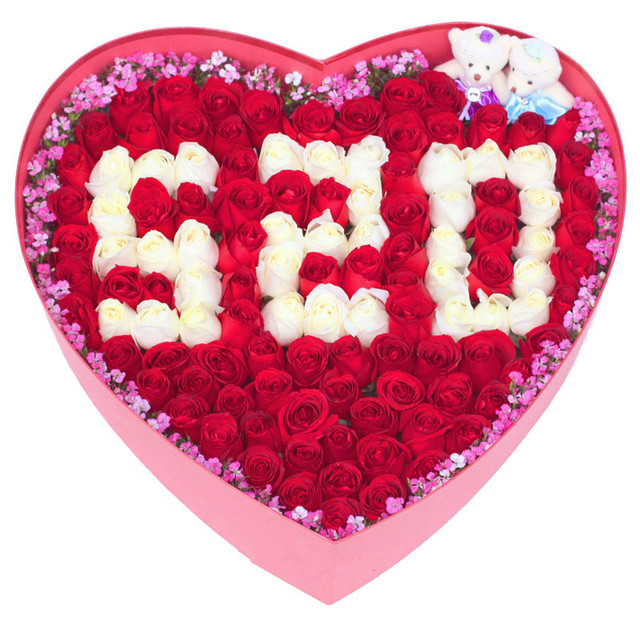 99朵混搭玫瑰(红、香槟),一对小熊,搭配相思梅