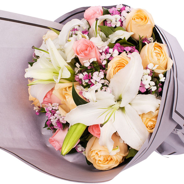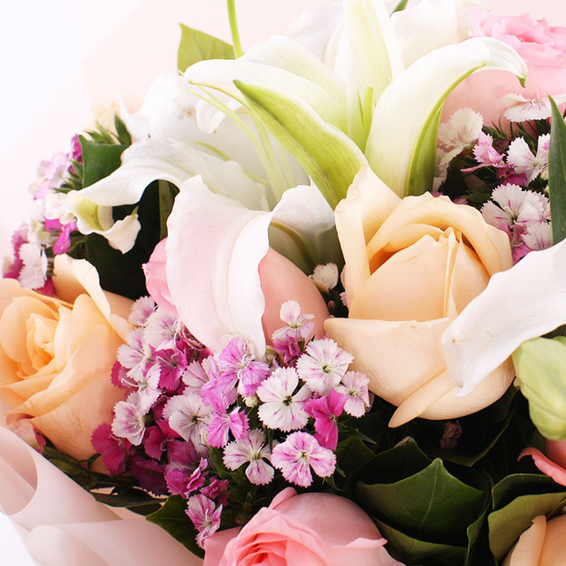 11枝混搭玫瑰(香槟、戴安娜)2枝白百合,相思梅、栀子叶