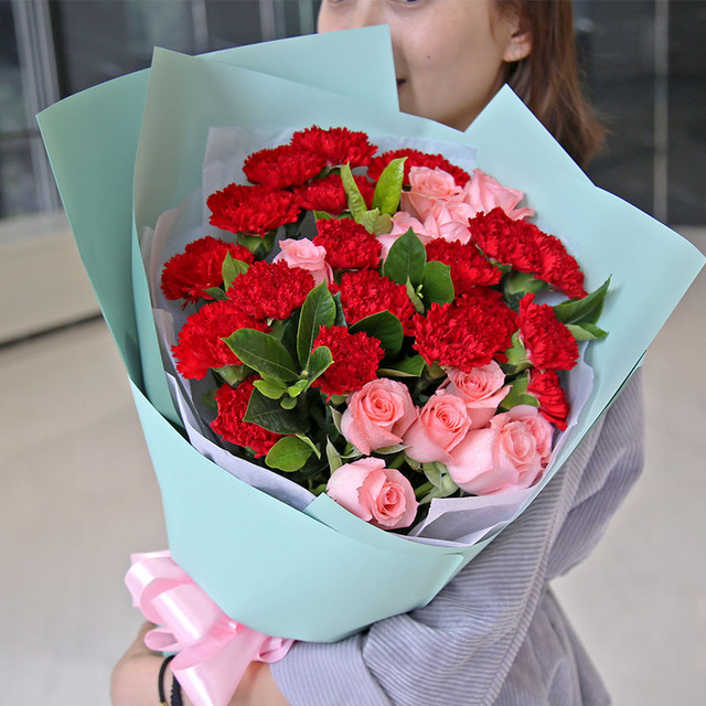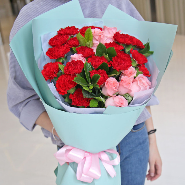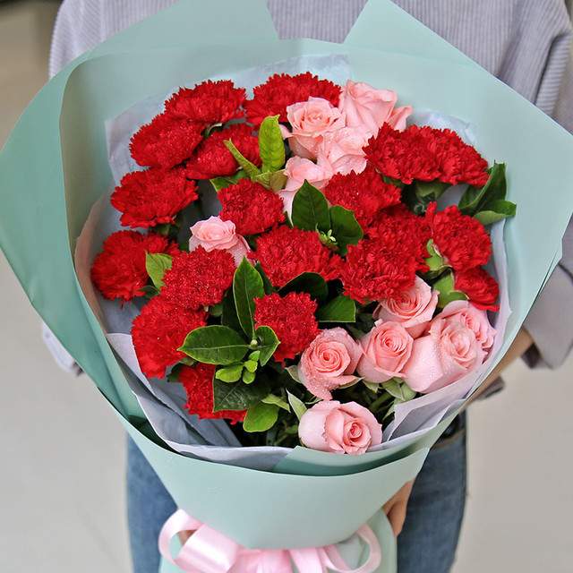 红色康乃馨19枝,戴安娜粉玫瑰11枝,栀子叶