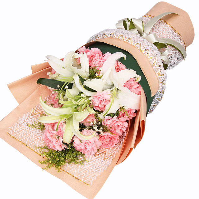 19朵粉色康乃馨,2枝香水百合,满天星、黄莺