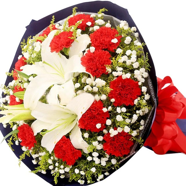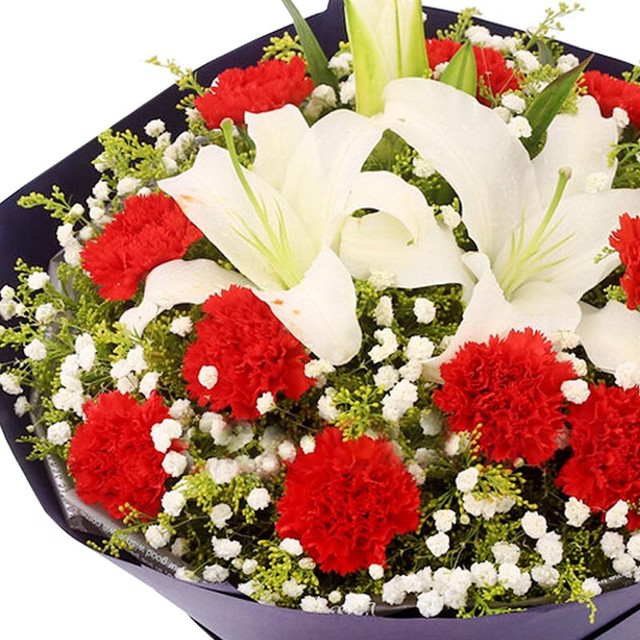11支红色康乃馨,1支多头百合,黄莺和满天星