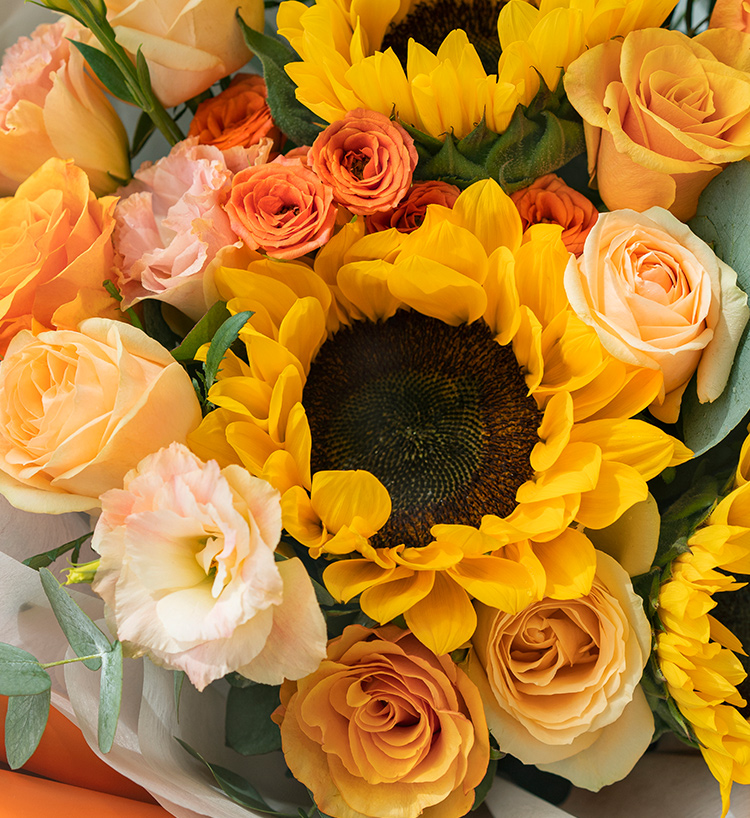 - 花材:向日葵3枝,香槟玫瑰6枝,辉煌玫瑰5枝,橙色多头泡泡2枝,香槟色多头桔梗3枝,尤加利叶若干支