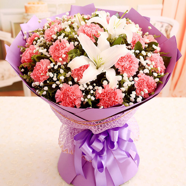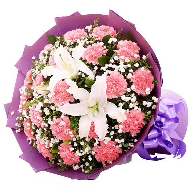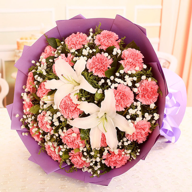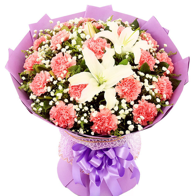 19朵粉康乃馨,2枝香水白百合,满天星、栀子叶