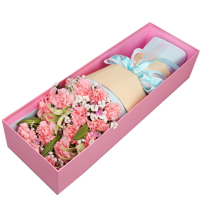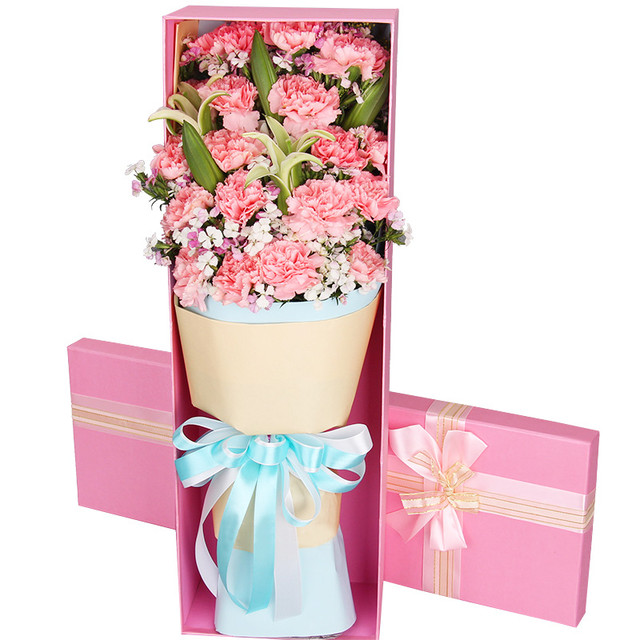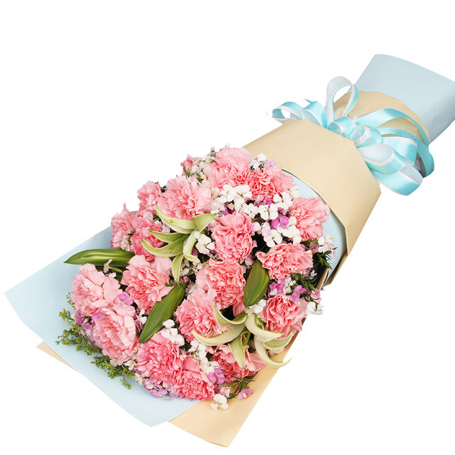 19朵粉色康乃馨,两支香水百合,相思梅、黄莺