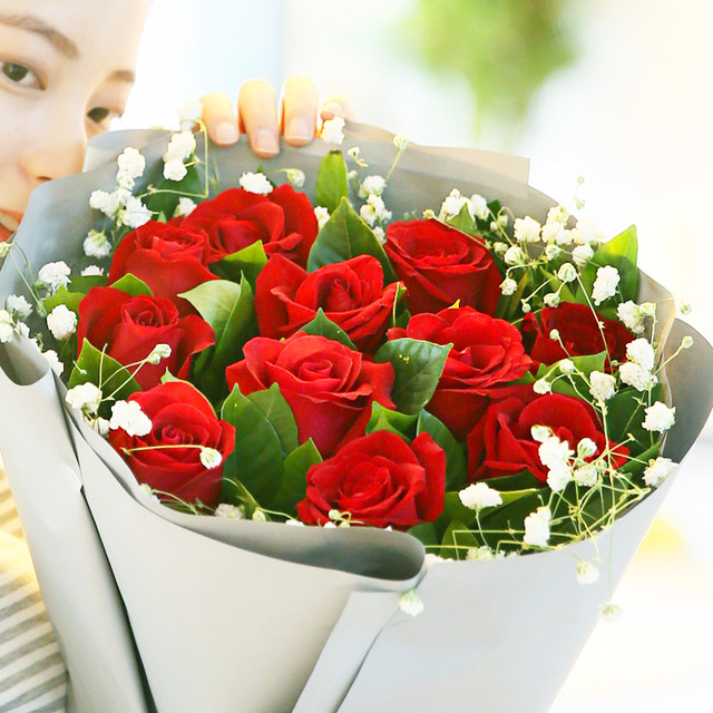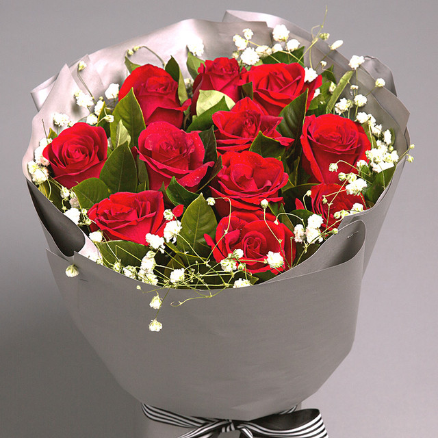 11枝红玫瑰,满天星、栀子叶