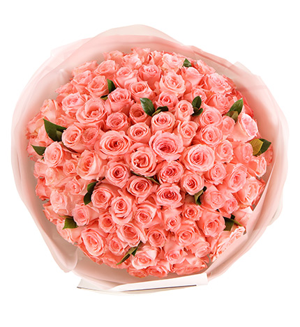 戴安娜粉玫瑰99枝(如戴安娜缺货,会用影星粉玫代替),栀子叶适量