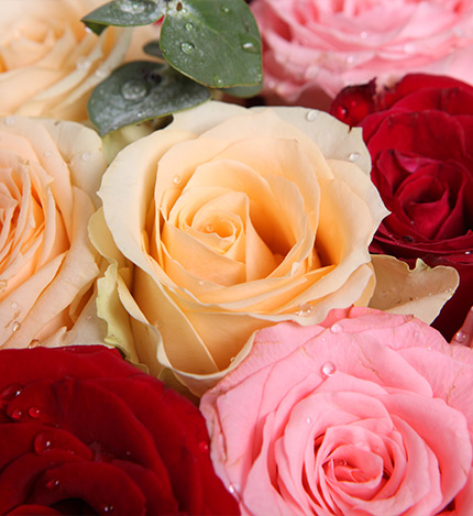 - 花材:33朵玫瑰混搭:戴安娜粉玫瑰15枝,香槟玫瑰13枝,红玫瑰5枝,搭配适量绿叶
