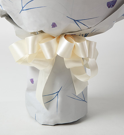 内层米白色纱,外层银灰色树叶草纸,米黄色缎带花结