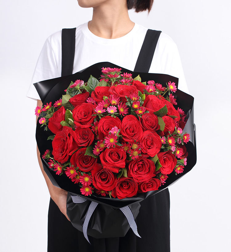红玫瑰33枝、红色小雏菊7枝、栀子叶1扎