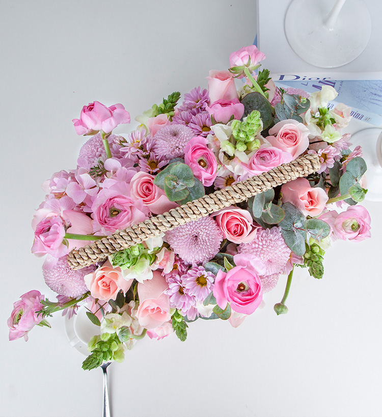 - 花材:粉佳人玫瑰10枝,粉色洋牡丹10枝(洋牡丹的花期为12-4月,其他季节用粉色多头玫瑰代替),粉色绣球1枝,粉金鱼草10枝,粉乒乓菊10枝,粉多头小菊5枝,尤加利叶10枝