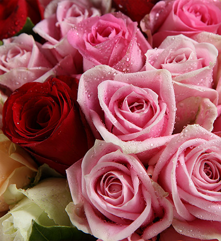 - 花材:各色玫瑰共50枝:粉玫瑰32枝(戴安娜粉玫瑰或玛利亚粉玫瑰),白玫瑰6枝,香槟玫瑰6枝,红玫瑰6枝,栀子叶10枝