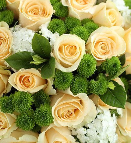 - 花材:香槟玫瑰33枝、绿色小雏菊8枝、白色石竹梅5枝、栀子叶3枝