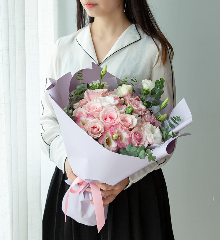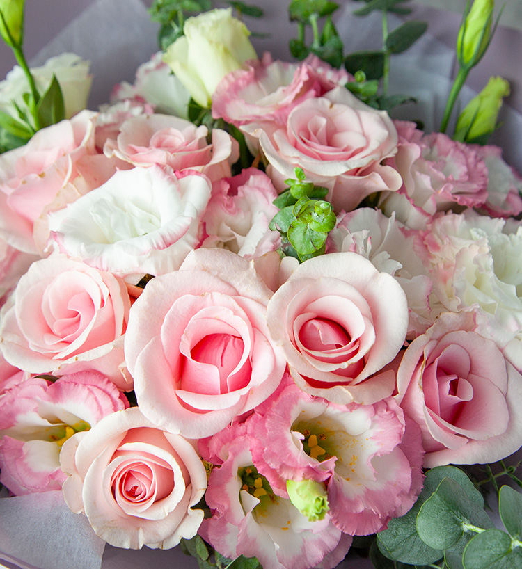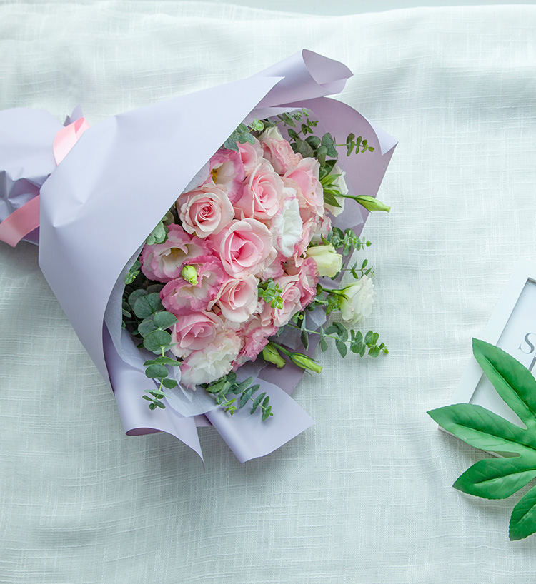 粉佳人粉玫瑰11枝,粉边/粉桔梗0.4扎,尤加利叶8枝