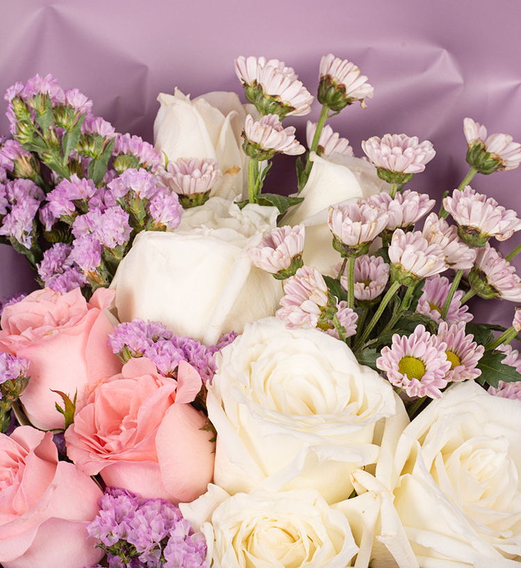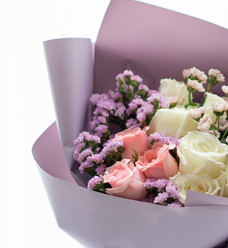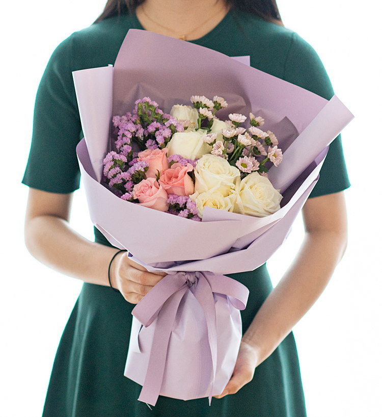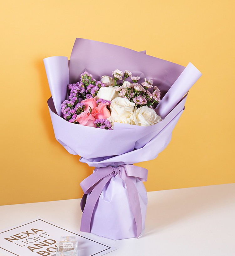 戴安娜玫瑰3枝,香槟玫瑰6枝,粉色勿忘我5枝,小菊3枝