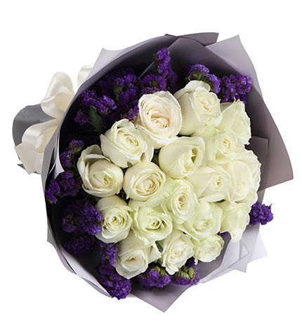 雪山白玫瑰19枝,紫色勿忘我5枝