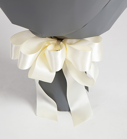 内层双色人造纸(浅紫色、香芋紫),外层深灰色opp纸,米白色缎带花结