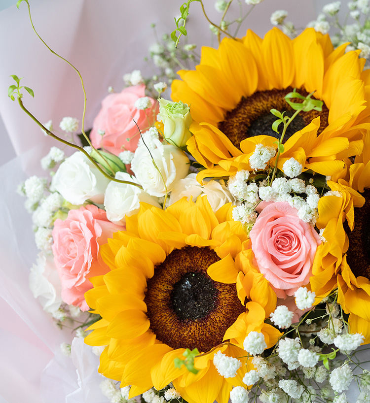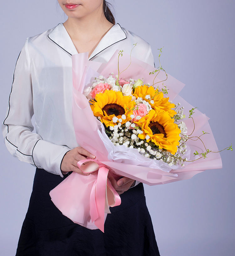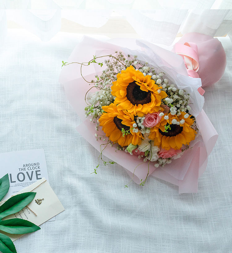 - 花材:向日葵3枝,戴安娜粉玫瑰6枝,白色洋桔梗0.2扎,满天星0.1扎,龙柳少许(龙柳可用兰草、常春藤枝干等类似线状枝条代替)