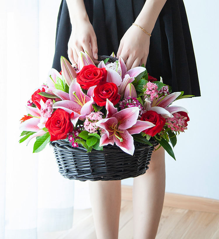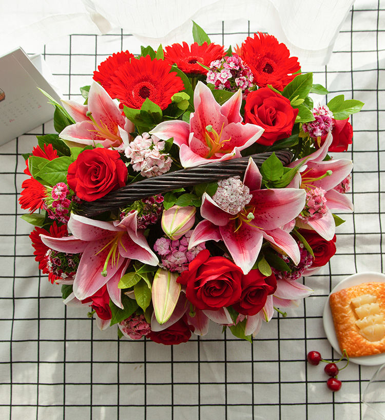 多头百合2枝,卡罗拉玫瑰8枝,红太阳花6枝,混色石竹梅0.3扎,栀子叶0.5扎