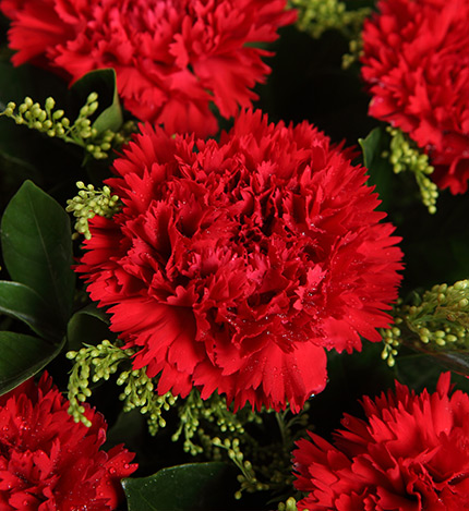 红色康乃馨11枝,黄莺10枝,栀子叶8枝
