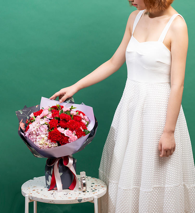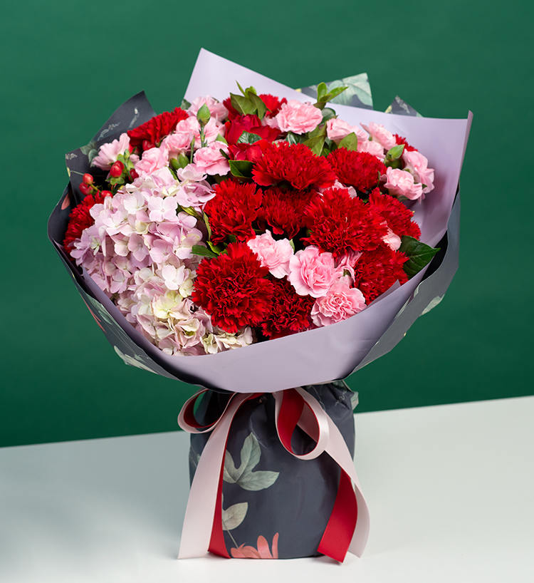 - 花材:红康乃馨10枝,粉色绣球1枝,红色多头玫瑰3枝,粉多头康乃馨5枝,栀子叶10枝,红豆10枝