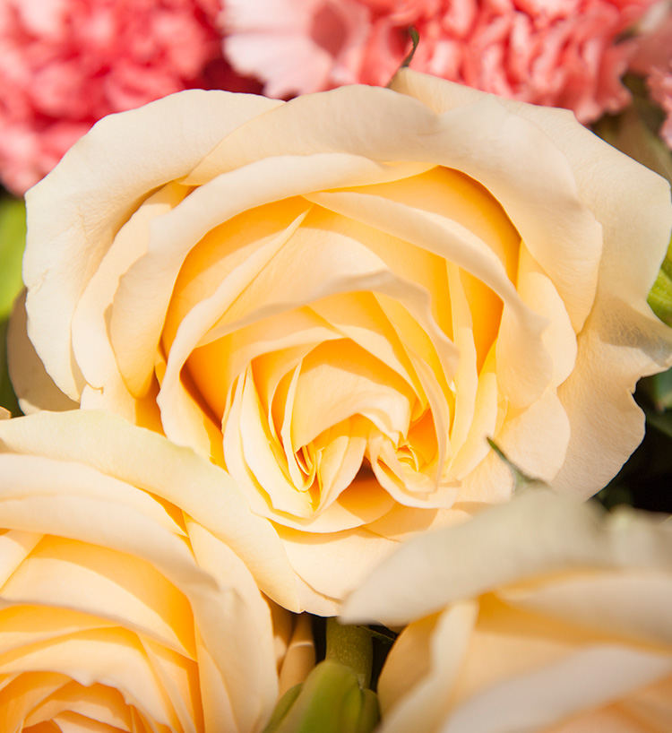 - 花材:香槟玫瑰9枝、多头白百合2枝、粉色康乃馨13枝