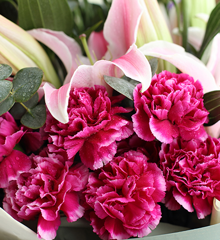 紫红色康乃馨9枝,粉色多头香水百合2枝,紫色桔梗4枝,尤加利叶10枝