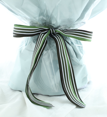 - 包装:蓝灰色绝色纸2张,墨绿色条纹纸2张,玻璃纸1.5米,白绿粗条纹罗文带1.5米