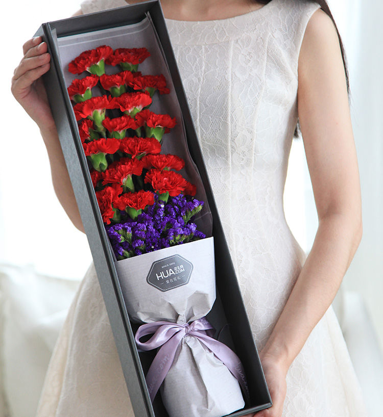 高档礼盒装鲜花:红色康乃馨19枝,勿忘我0.3扎