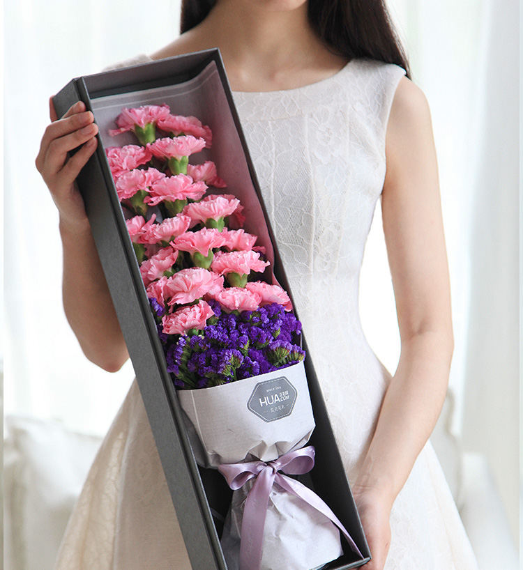 高档礼盒装鲜花: 粉色康乃馨19枝,勿忘我0.3扎