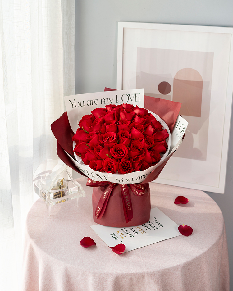 红色风华纸3大张、 白色小号英文插画纸(You are my love)4张、白色雪梨纸1张、酒红色罗纹烫金丝带2米