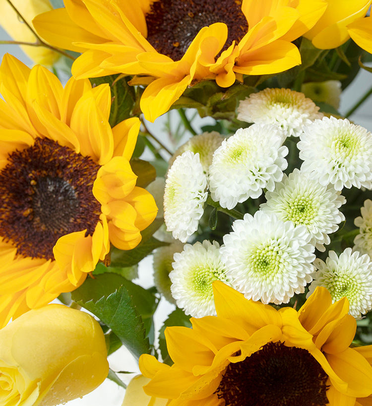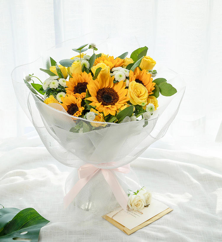 - 花材:向日葵5枝,多头金香玉玫瑰6枝,白色小雏菊3枝,千日白0.1扎,进口圆尤加利叶3枝