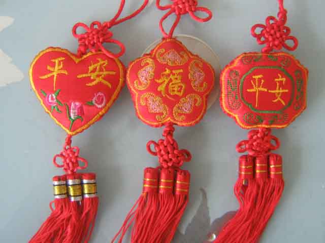 用各种代表色的布,剪成长十四公分、宽六公分的大小,上将它缝成长方形的袋子,在缺口内放入香料,用针线缝死,再将它做成吊饰即可完成了。